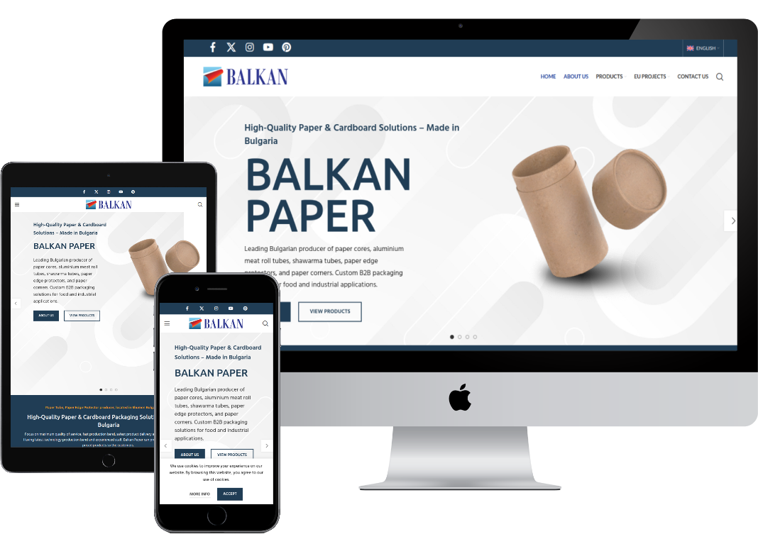 Извършихме пълен редизайн и модернизация на корпоративния сайт на Balkan Paper, производител на картонени тръби, шпули и хартиени опаковъчни решения. Проектът включваше обновена структура, по-ясна навигация и професионална продуктова презентация, насочена към B2B клиенти.